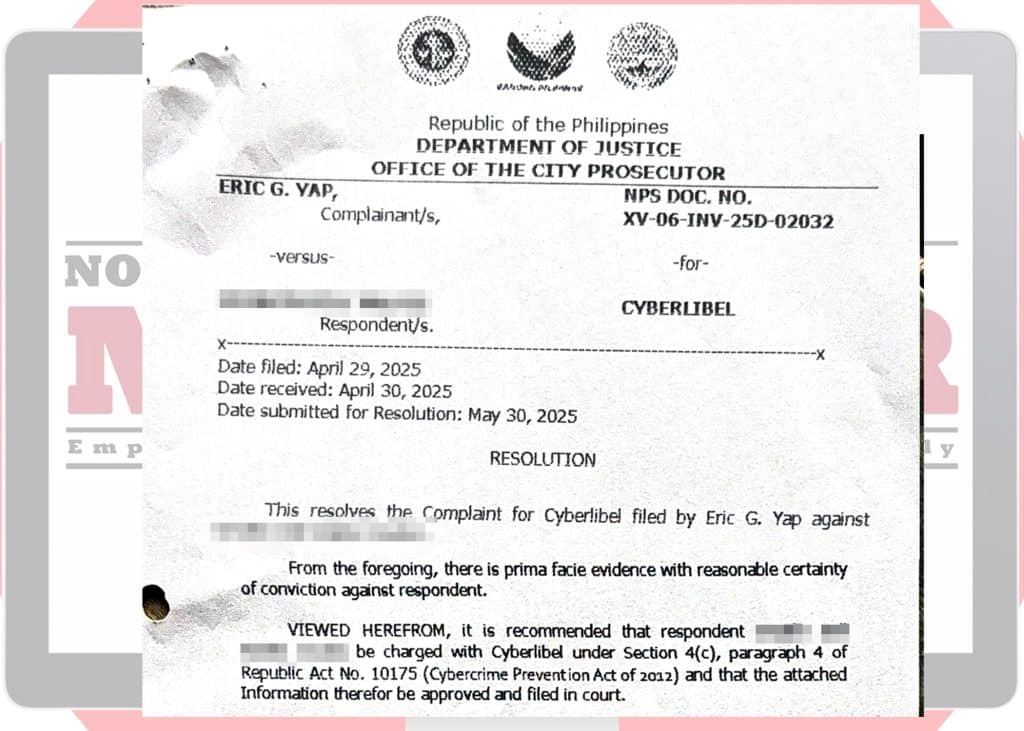 The Office of the City Prosecutor meanwhile said all the elements of cyberlibel were present in the case adding that the post contains implication that Yap may have benefitted from overpriced infrastructure projects, thereby suggesting criminal or illegal conduct.